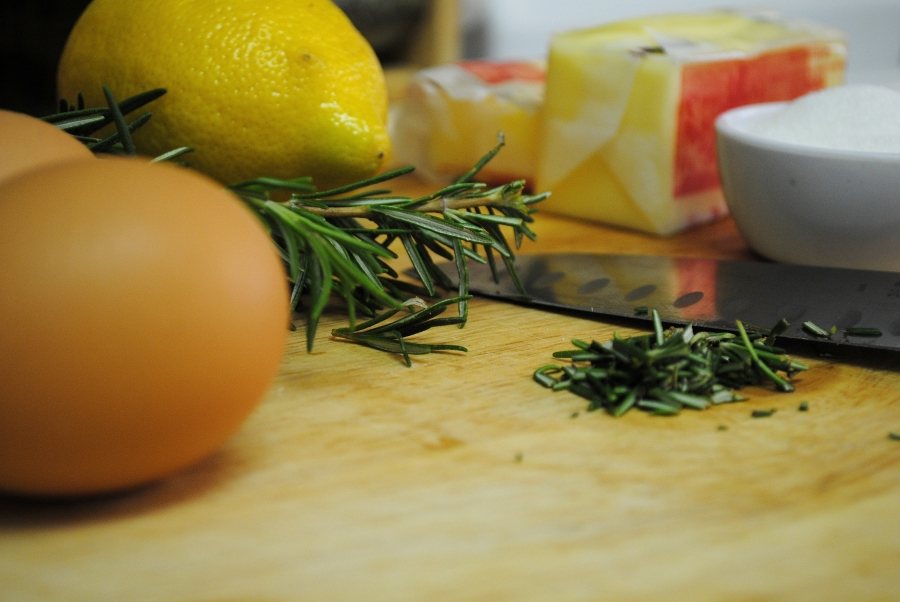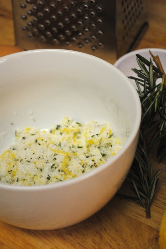 2. Place lemon zest, rosemary and sugar in a small bowl. Rub, rub, rub that rosemary and lemon zest vigorously, then set aside for a few minutes to allow the oils to release.