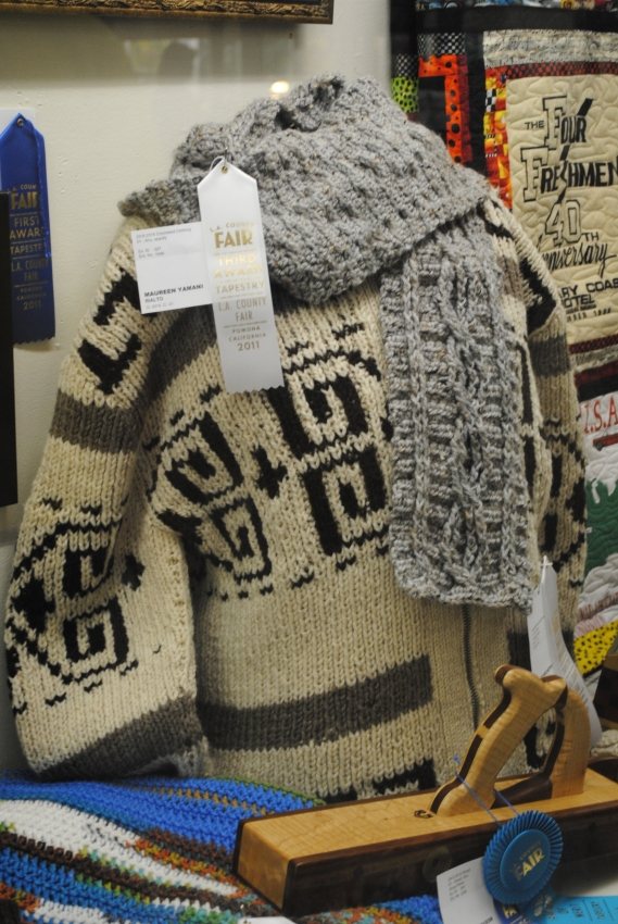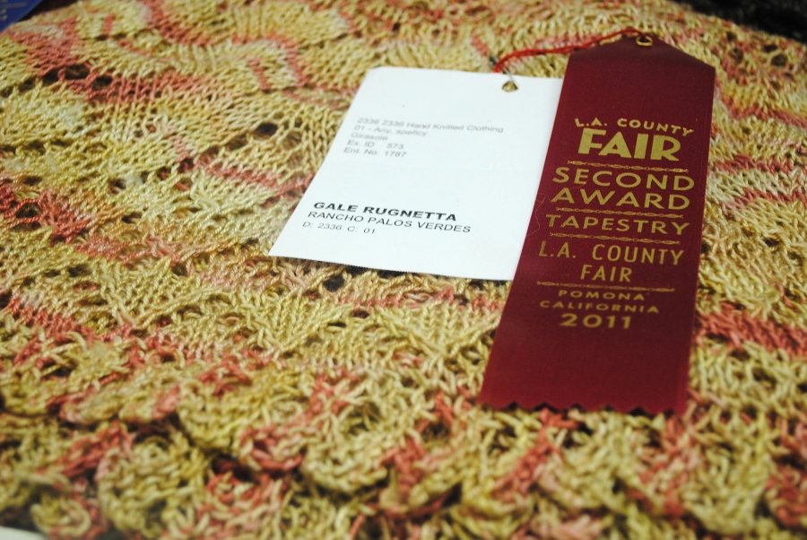 Then another 2nd place winner was Gale Rugnetta from Rancho Palos Verdes. She knit Girasole by Jared Flood. The yarn looks like Handmaiden Sea Silk in the Orchid colorway. I love playing name that yarn, so much fun. It would have been more fun if everything wasn’t behind glass and I really got to cop a feel.