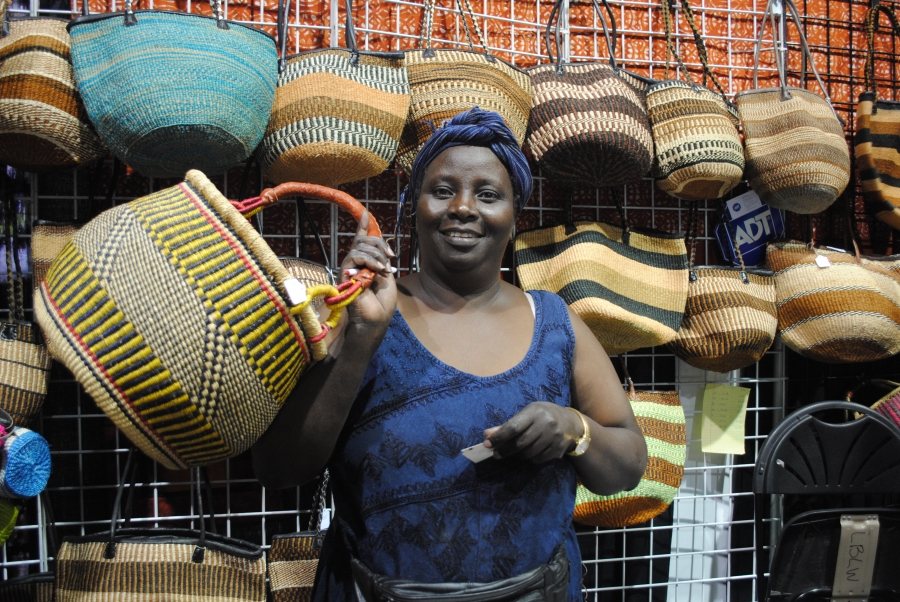 Then I headed over to one of the halls to go shopping. Yes, I had a very specific vendor in mind. When I was at VK Live I met Mary of Maendeleo African Imports. She asked me to come visit here at the fair, so of course I did. Here is Mary with my new knitting basket.