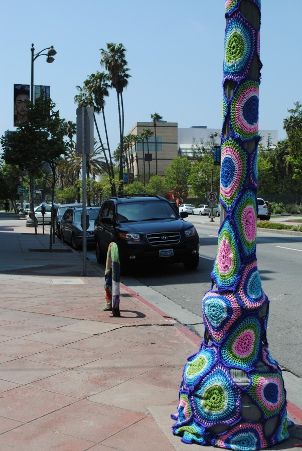 Remember, when yarn-bombing a good seam is very important! This was by far one of the coolest experiences ever. I didn’t get stopped by any cops or anyone… and way less people walked by here (even though I am right across the street from the Tar Pits Museum– as you can see behind me in the photo) than did on my quiet little street corner. Here is a photo of my yarn-bombing, the original bombers and LACMA in the background.