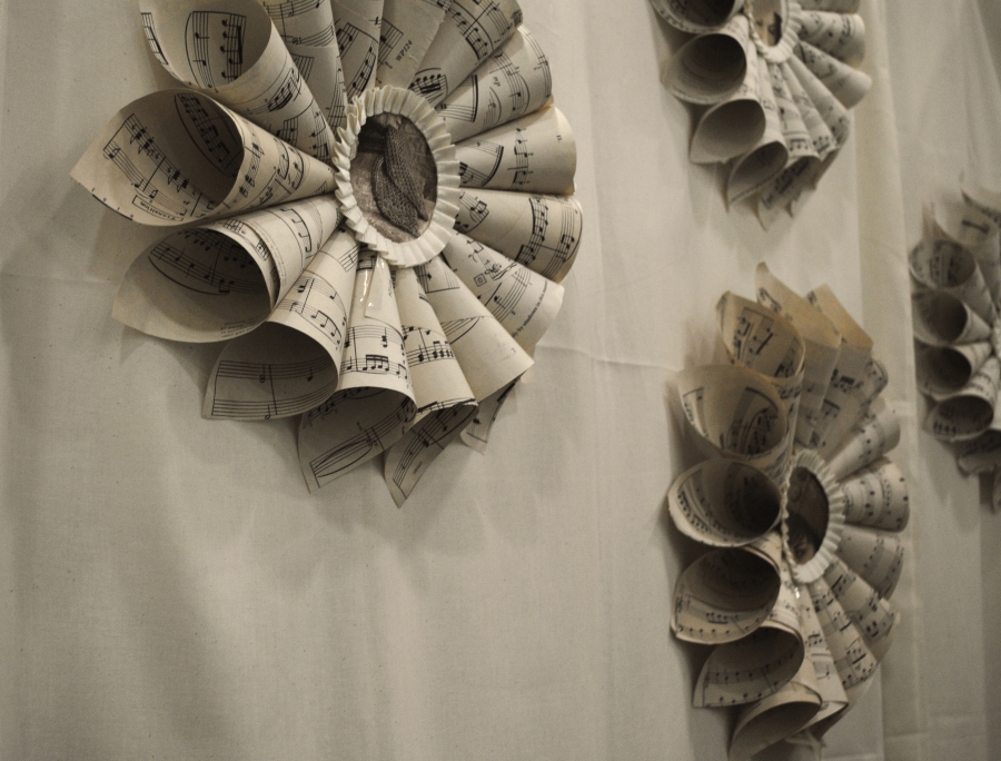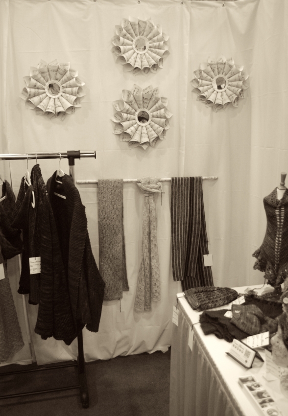 A close up of my sheet music wreaths- this was a lot of work. This image is in actual color (there isn’t much of it). It took weeks to dye all the sheet music. In the center of each wreath is a photo of one of my patterns. It’s hard to tell bu the one on the left is the Greenleaf Ascot. Then I trimmed them with ruffle ribbon. I actually had help in the hotel room from Heather Dixon (brilliant mind behind Army of Knitters) to roll and glue down all this sheet music. Thanks Heather- you’re such a good roller!