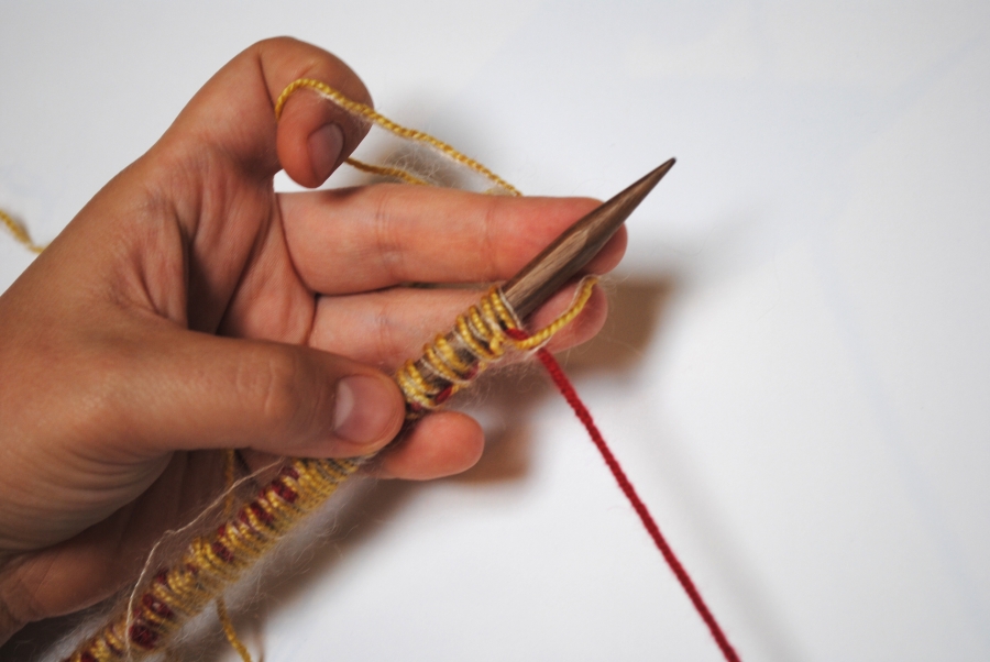 - Turn your work and begin to knit (in pattern) off your larger needle with your smaller needle