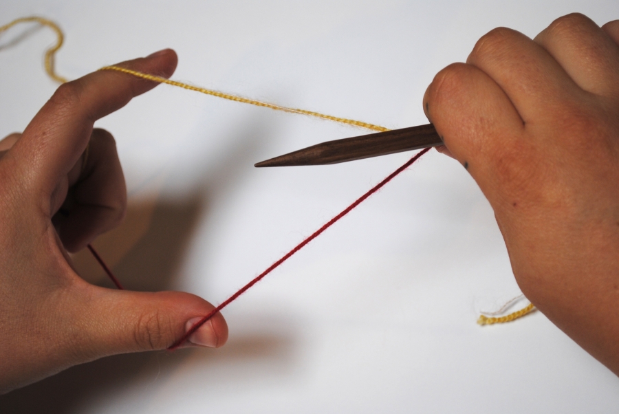 - Position the waste yarn in front and the working yarn in back and hold your needle above the yarn