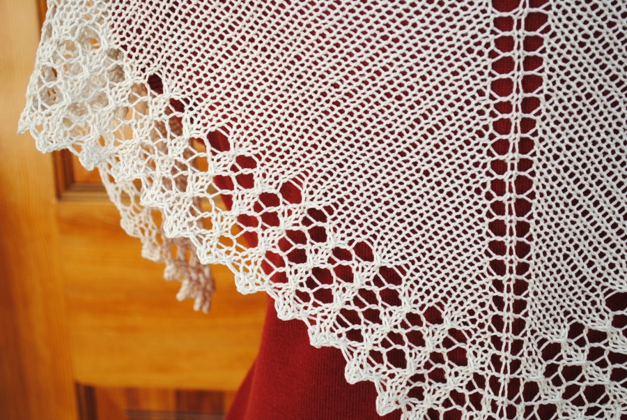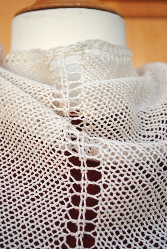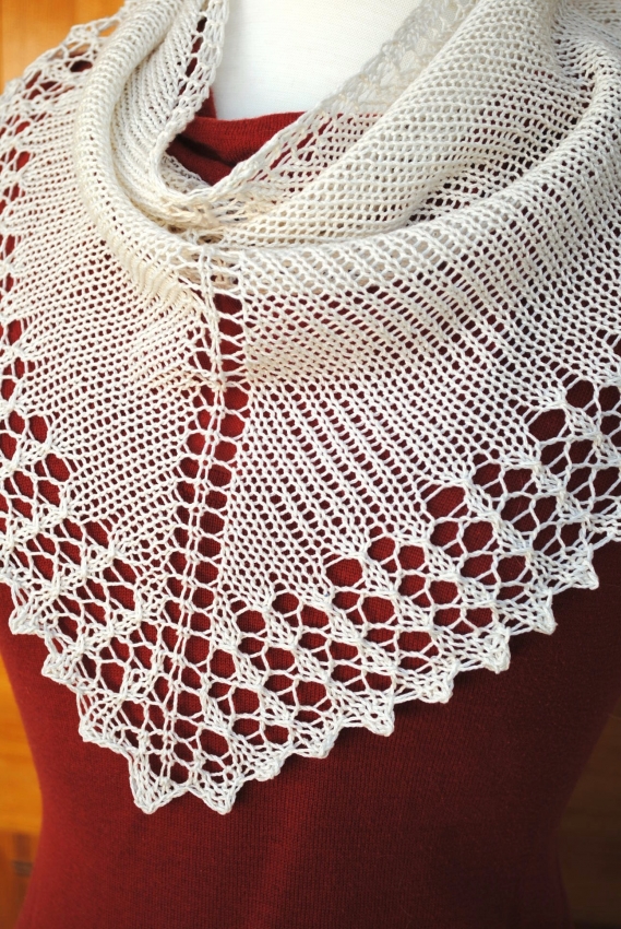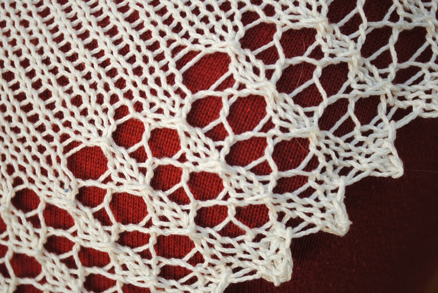 Right before my trip to A Good Yarn in Sarasota, FL, I decided to pack up a new knitting project (of course). I decided on Crashing Waves because I knew I needed a new one for my trunk show, its portable and I’ve memorized the pattern. So I picked out this really neat white yarn from my stash that I bought in Athens, Greece when I went there a few years ago. It is a 100% mercerized cotton with a Greek name that I can neither spell nor pronounce.
