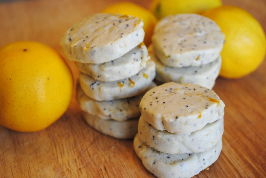 In a bowl mix together the flour and sugar. Add the butter and mix in carefully (I used a fork for this task). Then add in the egg yolks and vanilla extract and mix in well. Now you will add in the lemon zest and poppy seeds and mix them in well. Roll out the dough into a log that measures about 1.5″ in diameter and wrap in parchment paper. Refrigerate the log for at least 1 hour. Preheat the oven to 325º. Cut the log into pieces about 1/3″ thick. Bake cookies on a parchment lined baking sheet for 10-15 minutes. The cookies will not change color much, the longer you leave them in the oven the crumblier they will get. Enjoy these cookies with a nice hot cup of tea!