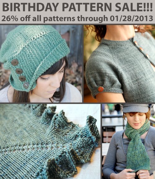 Birthday Pattern SALE!!!January 26, 2013Well, its been another year! Let us celebrate my birthday with yet another pattern sale! 🙂 today through Monday 01.28.2013 take 26% off all self-published patterns!!! Go shopping here!