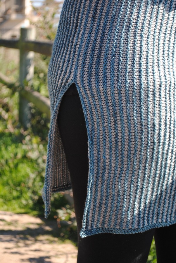 Knit in two pieces side to side this top can be made into a pullover or a tunic! The flattering vertical stripes make this piece a flattering fit for every body-type!