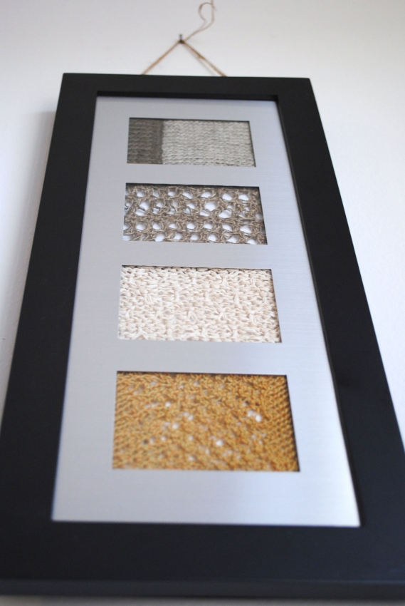 I have had a project in mind for them for a while now. I takes almost no time at all. I’m not really sure why it took me so long to do this. All you need is a frame with several spaces for photos. Not large spaces, smaller than 4″ (since that’s usually the size of a swatch). Then place your swatches in the spaces where the photos would go (fold where necessary so they dont overlap). You can also knit up swatches for this project with leftover yarns if you like. And voila! There you have it, knitted art! Perfect for a living room or knitting studio!